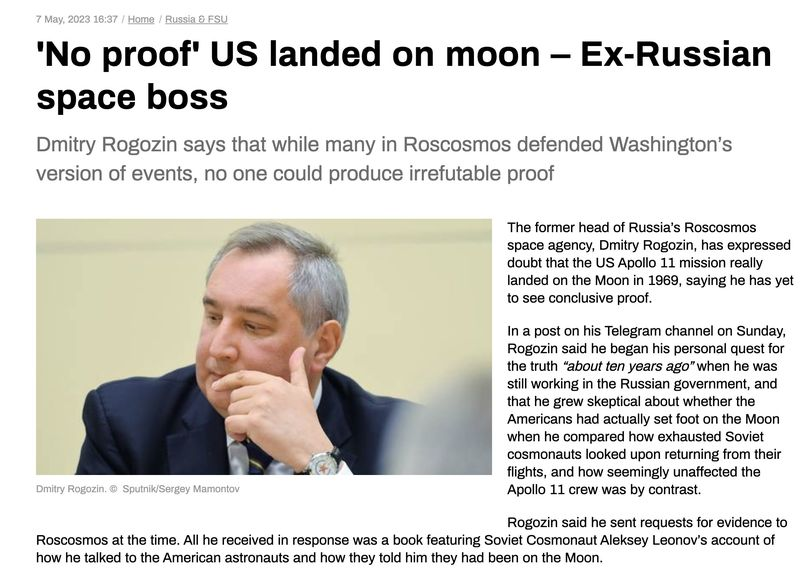 “Ex-Russian Roscosmos space boss Dmitry Rogozin has expressed doubt that the US Apollo 11 mission really landed on the Moon in 1969”