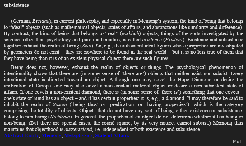 TODO-vérifier si “exister effectivement” ou “exister en soi” (Aristote) est une bonne définition informelle.
