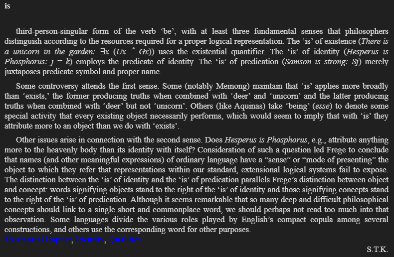 Par exemple, dans « Socrate existe », ce n’est pas une propriété de l’objet Socrate, mais une propriété du concept de l’objet : le concept « être Socrate » a la propriété d’être rempli/instancié.