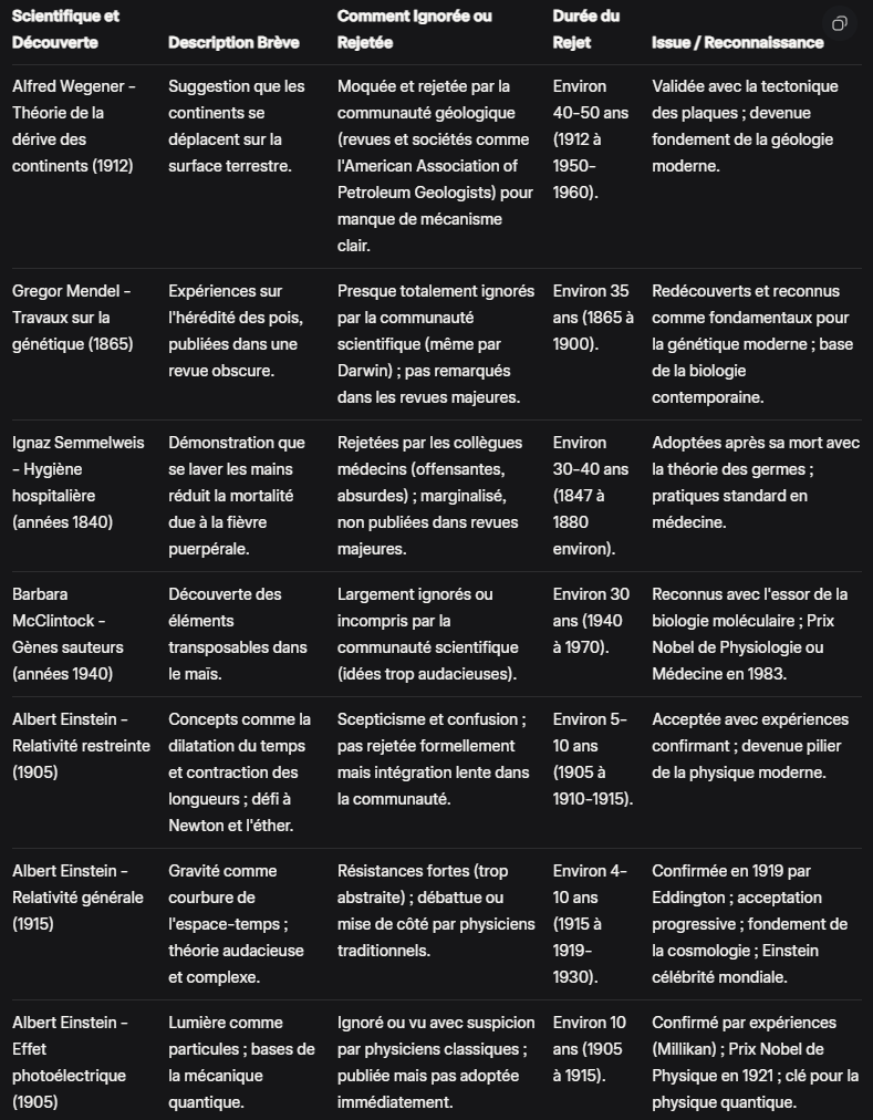 TODO : trier le tableau pour negarder que les découvertes qui étaient illégitimement rejetéées (par exemple, il paraît que le rejet dez Wegener était légitime car manquait de preuves).